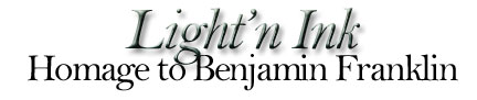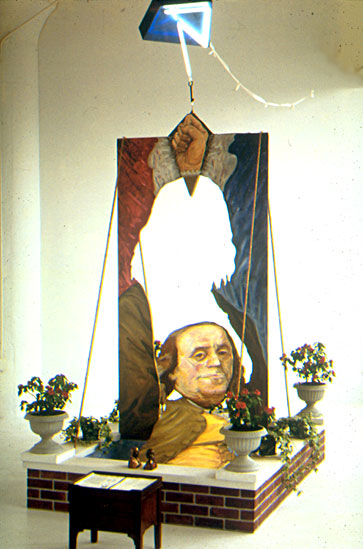 Description: 1998 mixed media A two sided wooden cutout stands above Ben representing his double agent role (first for England, then France), floats above a pool of water representing his birthplace on a bay and the ocean that separated his two main residences and his other maritime events. An urban colonial garden surround Franklin. Concepts: Oil Painting: Central figure and surrounding upright. Country Item: Antique American key from his time period. Contracted Art: Neon and the motorized kite. Pun: The title merges his loves of science (electricity via lightening) and writing with printing: "Light 'n' Ink". |