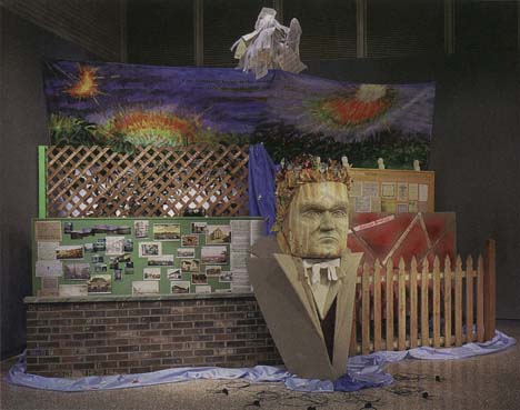 Description: 1992 mixed media An oil painted screen high in the backdrop for this visit to Beethoven's world. The scene includes: A thatch of musical composition types; a bulletin board of actual compositions; another bulletin board of images of his birthplace and later dwellings and concert halls; irregular planks and bumps of his would-be lovers; a brick wall of opus numbers and a picket fence of his teachers. All of this is surrounded by two vast streams of boats, which are a reminder of his living near the Rhine and the Danube Rivers. The center piece is a wooden carving of Beethoven's head with musical instruments bursting from his head. Concepts: Oil Painting: Backdrop. Country Item: A small German ceramic of Mozart (Ludwig's idol) at the clavier Contracted Art: An original Beethoven inspired piece of music was commissioned and is played on a continuous cassette loop from the mobile headphones. Pun: His divine ascendance is in the title, "Beat-Heaven, Beethoven". |