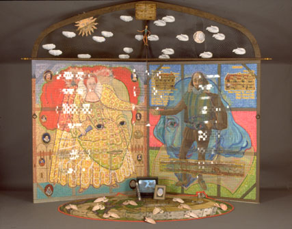 Description: 1991 mixed media Two large panels opens like a book to bring this historical couple together. On the floor is a rug, made to look both like a tapestry of William's Globe Theatre and Elizabeth's newly explored World. The hands floating above the panels accentuate the fact that there was a "contract made in heaven" between the two. The hands on the floor represent the applause from the theatrical ranks and English citizenry. Concepts: Oil Painting: Main panels. Country Item: A twelve inch ruler from Stratford on Avon displays an image of Shakespeare. Of course, Elizabeth was his true "ruler". Contracted Art: Printed transparent film containing sayings and history (and woven into a sheer frontal curtain), was produced by a graphic design firm. Pun: This piece introduced a quasi-pun that would be present in later pieces as well. Herb would find ways to create a sentence that would have a separate but connected meaning if read quickly. For example, at the top of the piece is a plaque reading "Will unto Liz Inn. Which speaks of the Queens' hospitality to him. And when read fast, the sentence becomes, "Willing to listen", which also demonstrates Elizabeth's willingness to patronize the theatre; and William's ready ear for the Queens' advice. |