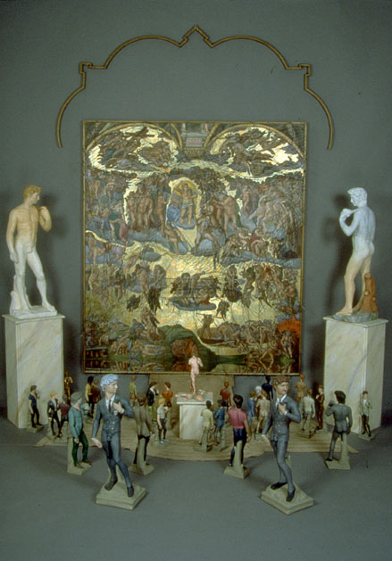 Description: 1984 mixed media An oil painting replica of the front wall of the Sistine Chapel is the centerpiece. Floating in front of the painting is a web of wire, brazed together, resembling a sketch of Michelangelo's face. As though in a museum, the statues of David, painted like patrons and guards, are meandering in front of the painting. Concepts: Oil Painting: Central item. Country Item: The gold leaf manufactured in Italy was used on the painting's background. Contracted Art: The dozens of unpainted statues of David. Pun: At the top of the wall is a name plaque which reads: "Iona" (Jona), this stands for Jonah, but may be read "I own a" (Michelangelo). In the middle is a figure holding the skin of a human. In the original mural, Michelangelo put his face on the skin, on this painting, Herb used his own face. |