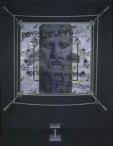 Description: 1980 mixed media An oil painting of a bust of Plato becomes the "canvas mat" of a boxing ring. The painting is covered with graffiti comprising Plato's sayings, ancient Greek architecture and humorous remarks. On the floor stands a Greek-inspired table with Disney's Pluto paying tribute to Plato (like the RCA dog "listening to his masters' voice.") Concepts: Oil Painting: Central item. Country Item: The dish, a Greek kylix for Pluto's offering. Contracted Art: The fluted pillars that hold the ropes of the boxing ring. Pun: Although the piece is full of wordplay, Herb becomes the pun by signing the piece |